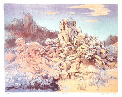 Alvin Sandler was a Brooklyn born New Yorker artist who lived and worked in México and Arizona. He has been awarded a Halgarten prize from the National Academy of Design, had solo shows at Long Island University and the Hudson River Museum. His triptych mural of 1965, called "The American Passion" is in the N.Y. Public Library's Shomberg Center. Sandler's graphic works have been published by the New York Graphic Society and Original Print Collectors, Ltd. His color etchings have received many awards, including one from the National Arts Club. Kathy and Sandler met in the late 1970s at the Printmaking Workshop Inc. and collaborated in printing viscosity.
