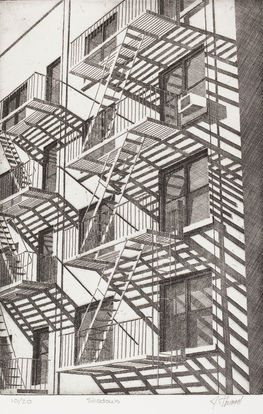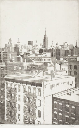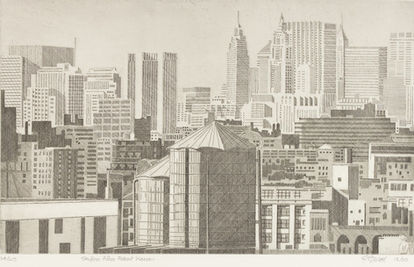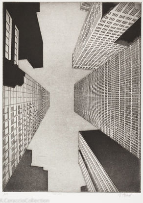 Jeff Atwood studied architecture at The University of Virginia and in 1998 he moved to New York, working for architects like Francoise Bollack and Rafael Vinoli Architects. Amongst his many architectural achievements, Atwood also worked on the renovation of the Morgan Library in 2006. In 2007 he began studying printmaking with Bill Behnken and Richard Pantell at The Art Students League of New York. His printmaking concentrated on capturing the complex architecture of New York City in bold and provocative images which often bridge the gap between realism and abstraction. The etchings explore vantage points with dramatic perspectives that frame, distort, and layer.